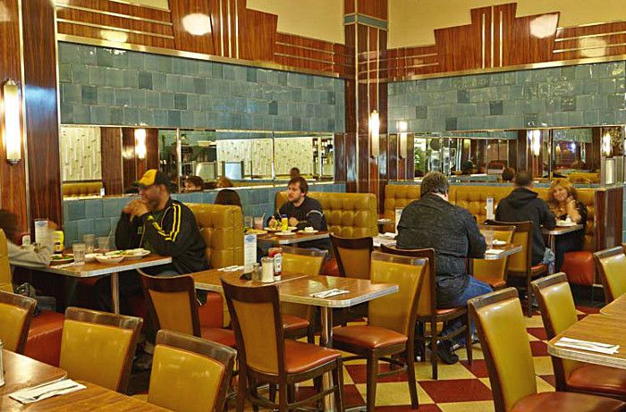 The Remedy Diner features an Art Deco decor. Address: 245 East Houston Street, at the corner of Norfolk Street.