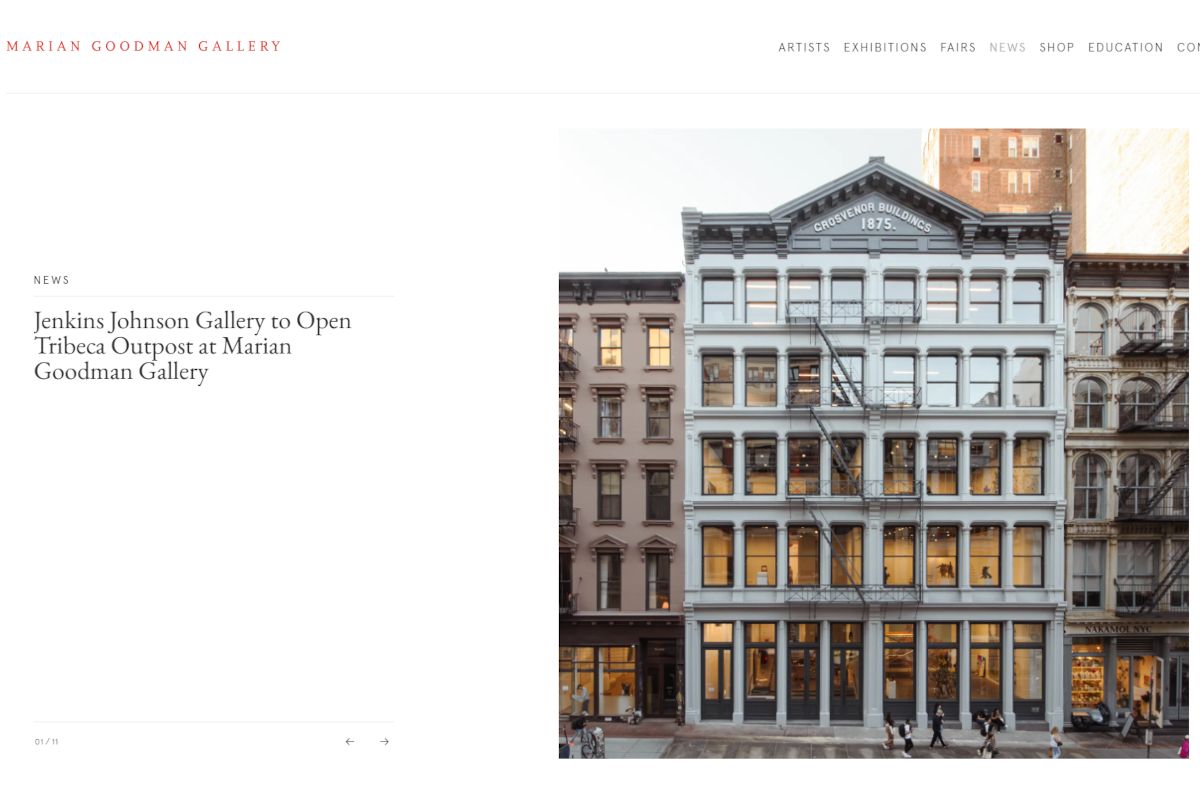 Screenshot of the Marian Goodman art gallery website in New York. Address: 24 West 57th Street, between Fifth and 6th Avenue.