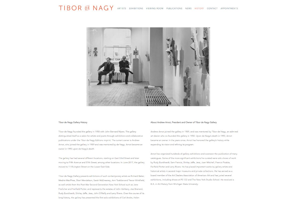 Screenshot of the Tibor de Nagy art gallery website. Address: 11 Rivington Street.
